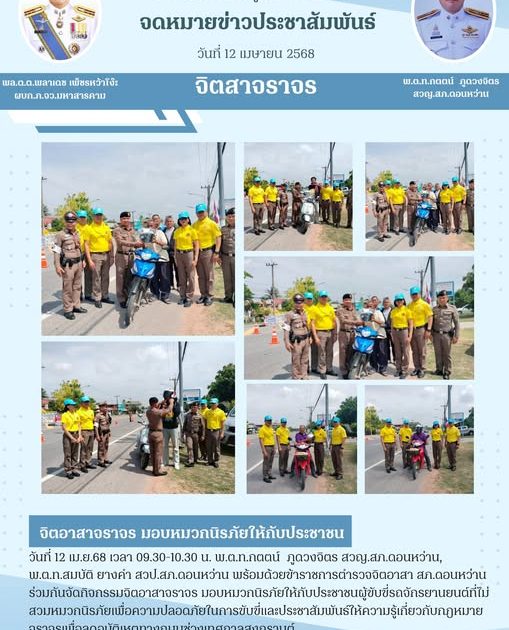 พ.ต.ท.กตตน์ ภูดวงจิตร สวญ.สภ.ดอนหว่าน, พ.ต.ท.สมบัติ ยางคำ สวป.สภ.ดอนหว่าน พร้อมด้วยข้าราชการตำรวจจิตอาสา สภ.ดอนหว่าน ร่วมกันจัดกิจกรรมจิตอาสาจราจร มอบหมวกนิรภัยให้กับประชาชนผู้ขับขี่รถจักรยานยนต์ที่ไม่สวมหมวกนิรภัยเพื่อความปลอดภัยในการขับขี่และประชาสัมพันธ์ให้ความรู้เกี่ยวกับกฎหมายจราจรเพื่อลดอุบัติเหตุทางถนนช่วงเทศกาลสงกรานต์