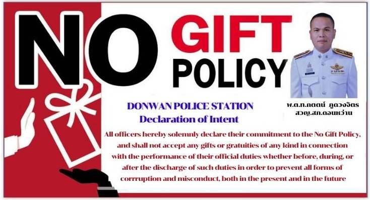 พ.ต.ท.กตตน์ ภูดวงจิตร สวญ.สภ.ดอนหว่าน ร่วมประกาศเจตนารมณ์ นโยบายต่อต้านการรับสินบน (Anti-Bribery Policy) และการไม่รับของขวัญของกำนัลหรือประโยชน์อื่นใด (No Gift Policy) จากการปฏิบัติหน้าที่ ประจำปีงบประมาณ พ.ศ.2568 ทุกชนิด